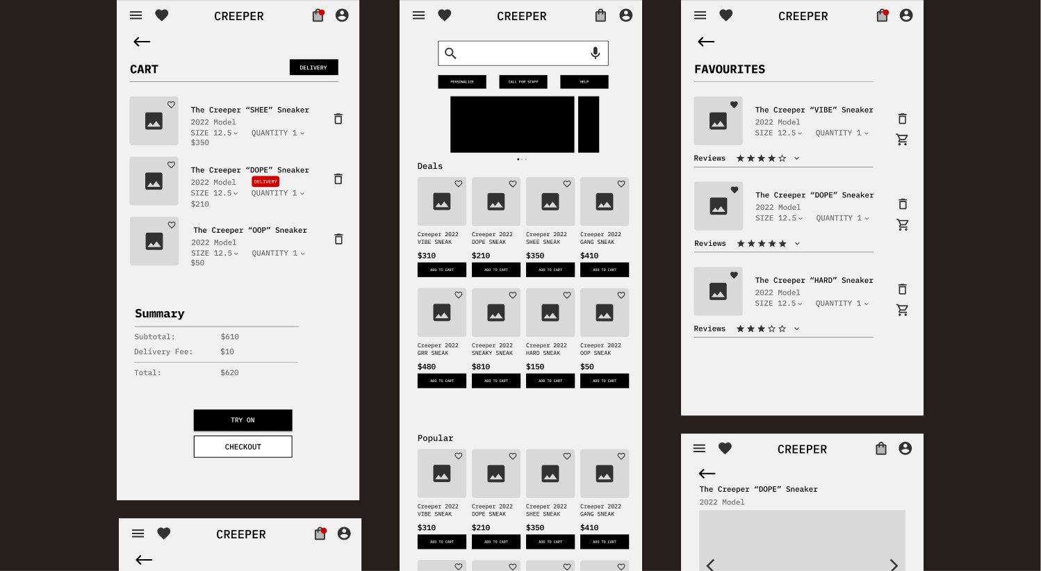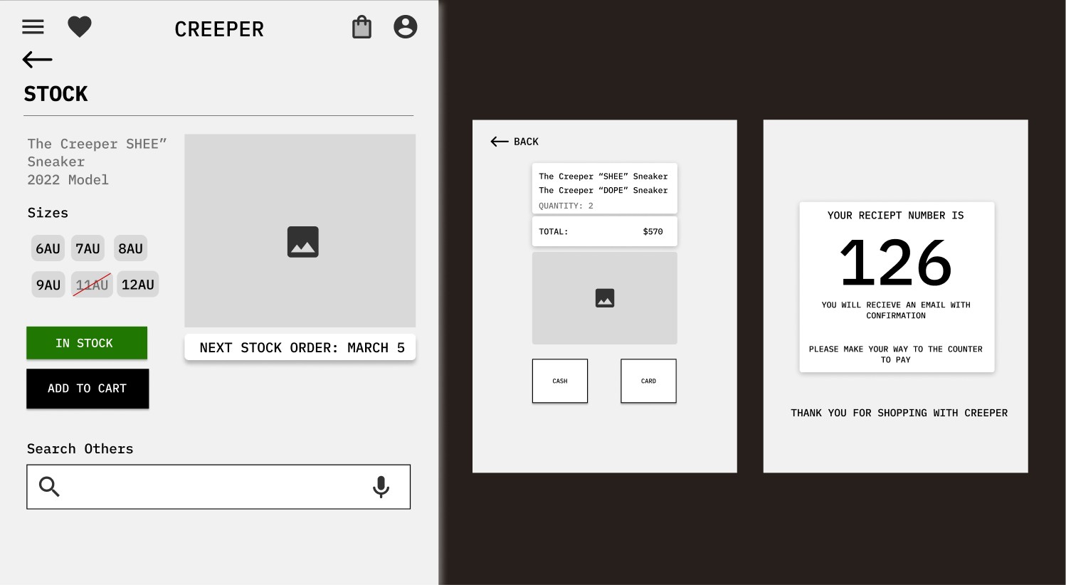 This project involved designing a kiosk interface for a sneaker store aimed at helping users find the right shoes while reducing the anxiety often associated with sneaker shopping. Focusing on user research and functionality, the interface features a minimal aesthetic inspired by brands like Off-White and is designed to feel as intuitive as a McDonald’s kiosk. It integrates typical online shopping features with unique in-store options like Call for Staff, Try On, and Checkout, creating a seamless, personalised experience. Overall, the kiosk enhances the in-store shopping journey, making it more efficient, user-friendly, and enjoyable.