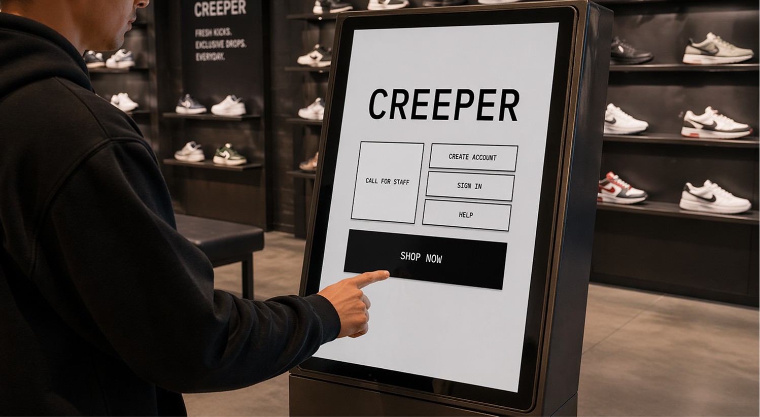 This project centres around designing an interactive kiosk for a contemporary sneaker retail environment, where the product isn’t just footwear but a cultural staple valued for style, performance, and personal expression. Sneakers have evolved into both everyday wear and collector‑driven products, with shoppers often seeking deeper engagement and guidance when browsing choices. The kiosk aims to bridge that gap by offering a digital, self‑service experience that supports discovery, selection, and personalised assistance within the store. By combining the convenience of online browsing with tactile, in‑store interaction, the design aims to enhance the overall sneaker shopping journey.